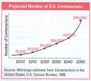 The US Census Bureau is predicting a huge increase in the number of individuals living to 100 years of age or more, as per the following graph.