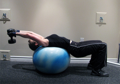 Pullovers can also be done using an exercise ball. Lie down on the ball so that your shoulders and upper back are resting on it. Walk your feet out until your body is in a straight line parallel to the floor. Then perform the exercise just as you would on a weight bench.