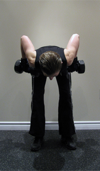 - Lean forward, knees slightly bent and back parallel to the floor. (You will often see people doing this exercise with their back at a 45° angle rather than parallel to the floor. While this does allow a person to lift heavier weights, it can also place excessive stress on the lower back.)