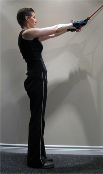 - Stand with your feet approximately shoulder width apart, knees slightly bent. Grasping the tubing, extend your arms in front of you, keeping your elbows bent very slightly to protect the elbow joints. Position yourself so that there is resistance on the tubing with your arms extended forward.