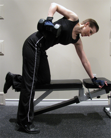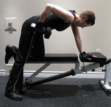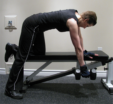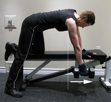 - Kneel on the bench with one knee and use the same side hand to brace yourself. Your back should be flat (as opposed to rounded) and parallel to the floor.