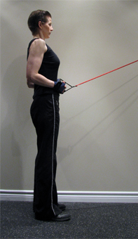 - Grasp tubing and lift your arms up while stepping back until you have the correct amount of tension on the tubing. Your arms should be almost straight, with just a slight bend in your elbows to prevent the joint from locking out during the exercise. Palms face downwards.
