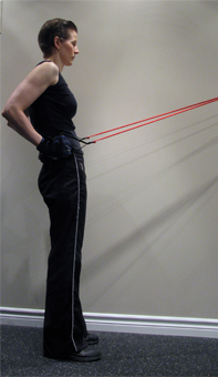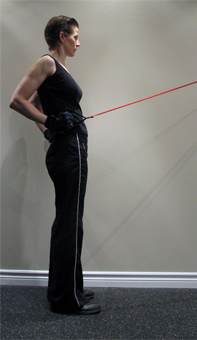 - Draw the tubing towards your waist, squeezing your shoulder blades together and keeping your elbows close to your body. Make sure that you are positioned far enough back from the tubing anchor point so that there is enough resistance on the tubing to challenge your back muscles.