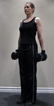 - Grasp a dumbbell in each hand and hold them at the sides of your body, palms facing you. Feet should be approximately shoulder width apart so that you have a firm base.