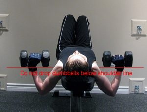 - Complete only as many repetitions as you can perform in a safe and controlled manner. Push yourself, but NEVER go to failure on this exercise as you could drop a dumbbell on your head and seriously hurt yourself. You could also lose control of the dumbbells on the way up or down if your chest muscles fail and then gravity would cause the dumbbells to drop and seriously injure your shoulder joints as they absorbed the force of the weight.