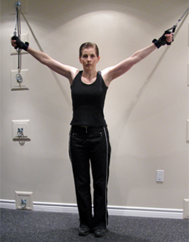 - Starting position will vary for each individual, depending on their natural flexibility. You should feel a slight stretch on your shoulders, but not so much of a stretch that the shoulder joints are in danger of being damaged. Your objective is to pre-stretch the chest muscle without impinging your shoulder joints. (Refer to Basic Workout Guideline #6.) NEVER drop your hand position below your shoulder as doing so can impinge the shoulder joint and cause serious injury.