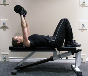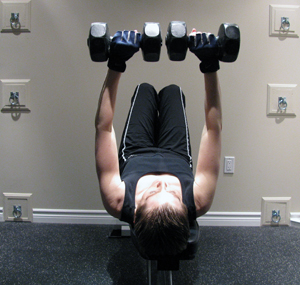 - Flex (tighten) your chest muscles and lift the dumbbells up in a smooth, flowing motion to meet above your eyes. DO NOT LOCK YOUR ELBOWS STRAIGHT OUT during this lift process as serious joint injury could occur. Your arms should remain slightly bent at the top of the lift to avoid stressing the elbow joint.