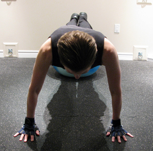 Once you've mastered regular pushups, here's something you can do to further challenge your sense of balance and muscular control. Start with one hand flat on the floor and the other on a raised surface. After completing your first push up, move the hand that was on the floor to the raised surface and shift your body over so that the opposite hand is now on the floor. Do another pushup and then switch back. This can be done on a stable surface (i.e. phone book) to start, and then to additionally challenge your stabilizing muscles you can progress to a medicine ball. But exercise caution - a wipeout could lead to a broken nose and/or broken teeth!