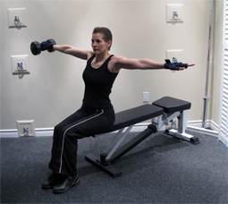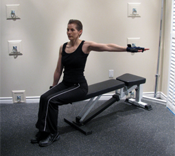 The lateral raise is the best exercise for isolating the lateral head of the deltoid muscle. It can be done from either a standing or seated position. You will find the seated position more challenging, because you are less able to use body torque to lift the weight. (Not that you deliberately want to use body torque when you are standing - in fact, the opposite is true. But there is a tendancy for the rest of the body to want to help the shoulder get the weight into the air, so be cognizant of this and try not to let it happen.)