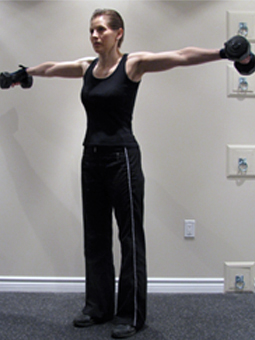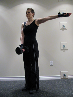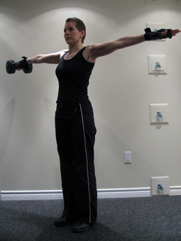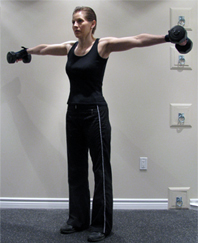 Lateral raises can be done using either dumbbells or tubing. Here is the basic movement using dumbbells from a standing postion: