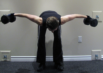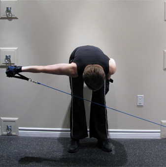 One arm bent over raises are more safely done with tubing, as shown below. However, if you do wish to try the one armed exercise with dumbbells, I recommend doing it from a seated position to minimize risk to your lower back. Holding your free arm out to the side will help keep the stress on your back more evenly balanced, plus it has the added advantage of working the shoulder muscle of your free arm by making it hold the arm balanced and steady throughout the exercise.