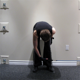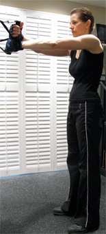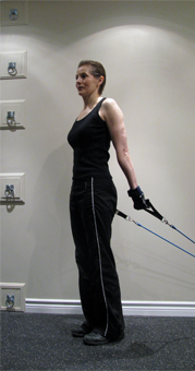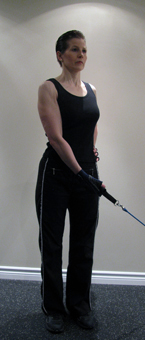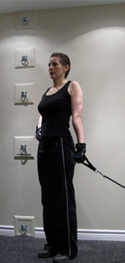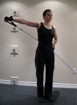 - Facing the secured end of the tubing, grasp each handle in opposite hand. Cross your arms across your body at about shoulder height.