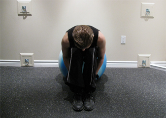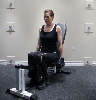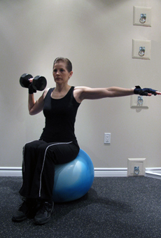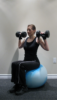 - Until you are sure you have good control of the dumbbells, use a chair to support your lower back to protect it from injury. Once you are comfortable with the exercise, graduate to sitting on a weight bench or other surface without lower back support before trying the exercise on a stability ball - see below.