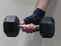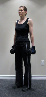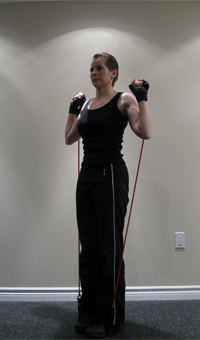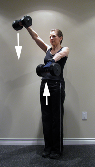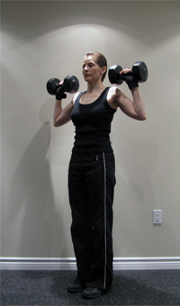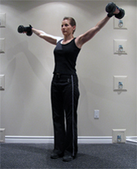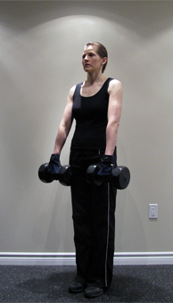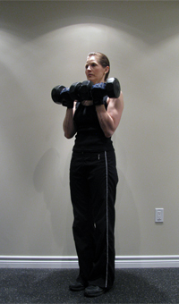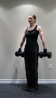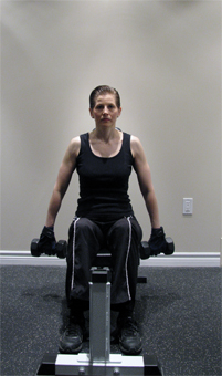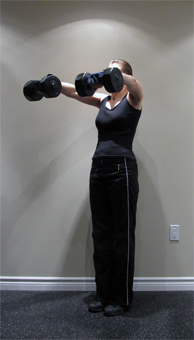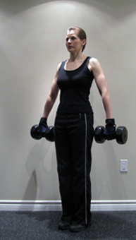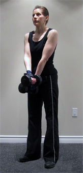 This exercise can be done from either a standing or seated position, using dumbbells or tubing. Here is the basic movement using dumbbells in a standing position: