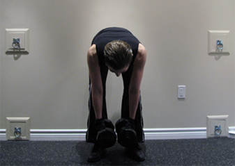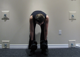 - With knees bent, lean forward so that your back is parallel to the ground. Extend your arms towards the ground, holding the dumbbells with palms facing each other, dumbbells close together but not touching.