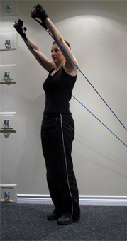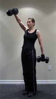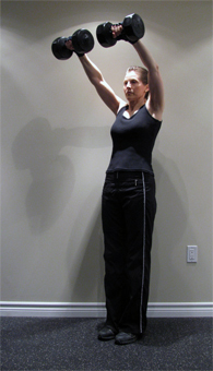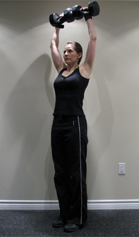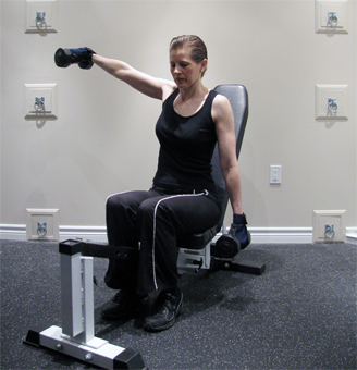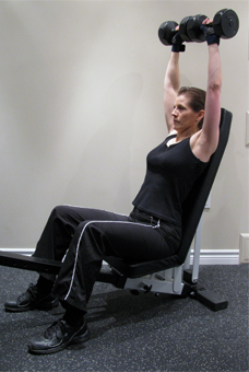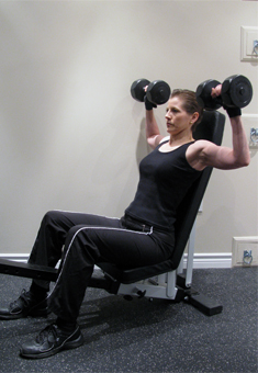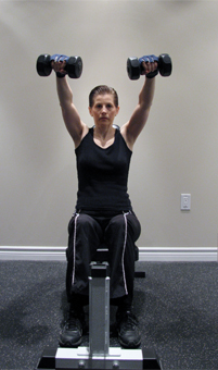 You can do overhead shoulder presses using either dumbbells or tubing. Here is the basic movement for the overhead shoulder press with dumbbells, from a seated position:
