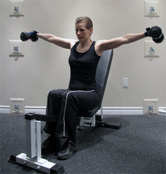 Seated Lateral Raise with Dumbbells When doing seated lateral raises, lean forward slightly to get the shoulder muscle pre-stretch. As you raise the dumbbells, make sure you keep leaning forward - sitting up straight will allow you to use body torque to lift the weight, and it will also put strain on your lower back.