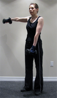 Front raises can be done using either dumbbells or tubing. Here is the basic movement using dumbbells from a standing postion: