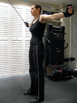 - Barely pausing, bring your arms back to the starting position in a controlled manner. Don't let the tension on the tubing do the work. You want to keep as much stress as possible on your shoulder muscles during the return motion so they don't get a chance to recover between reps.